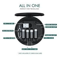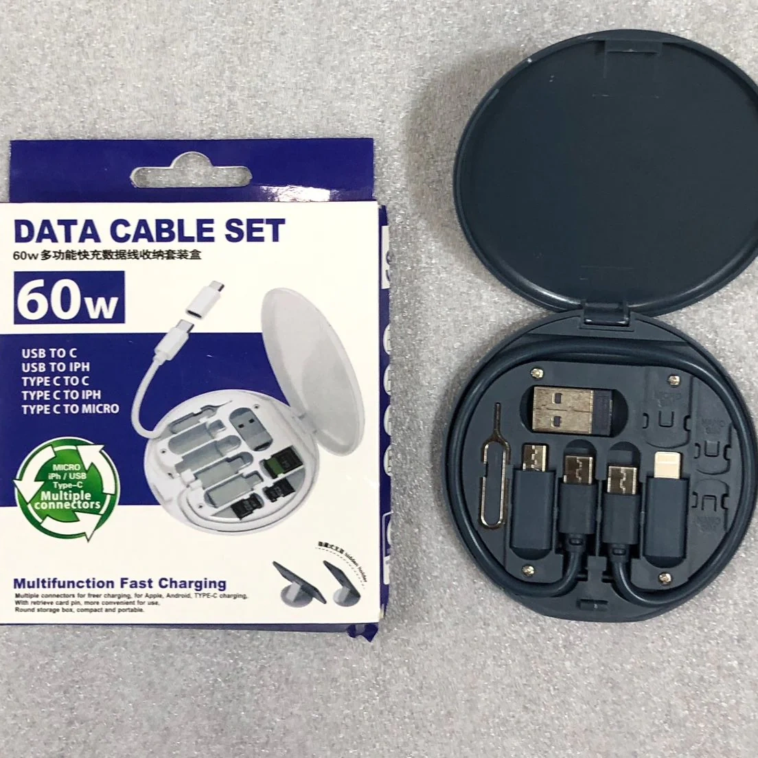 A 60W all-in-one data cable set is a compact travel kit with a central USB-C cable and various magnetic/plug-in adapters (USB-C, Lightning, Micro-USB) to charge and sync diverse devices, offering up to 60W power delivery, 480Mbps data transfer, a built-in phone stand, and storage for SIM/microSD cards, all housed in a small, portable case.