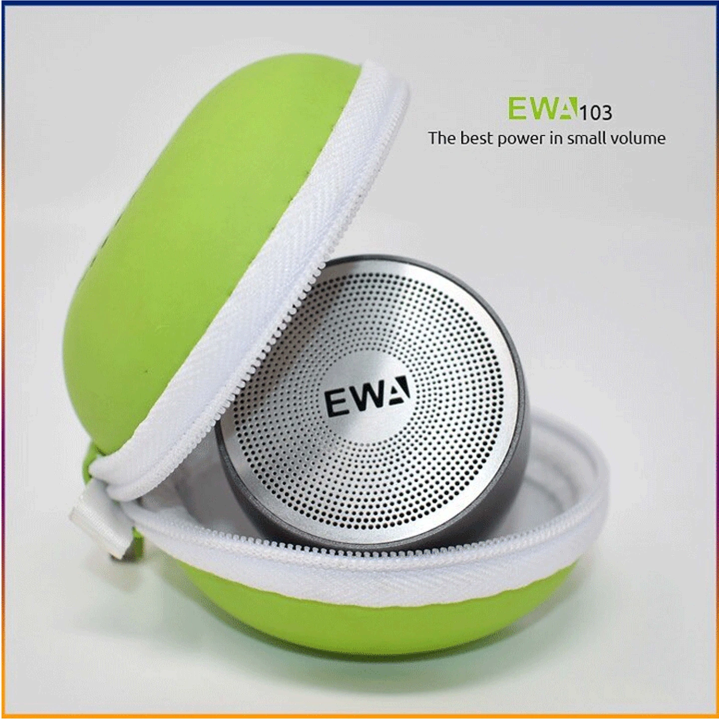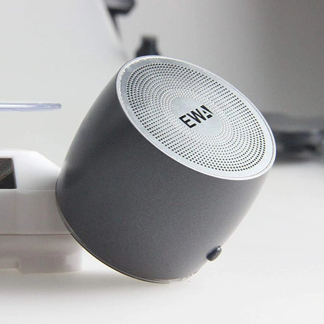 The EWA A103 is a portable Bluetooth speaker with a 500mAh battery, 3W output, and up to 4 hours of playtime. It connects via Bluetooth 5.0 for a range of up to 20 meters and features a cylindrical metal design with enhanced bass, a microphone for hands-free calls, and easy button controls. The device charges in about 2 hours.