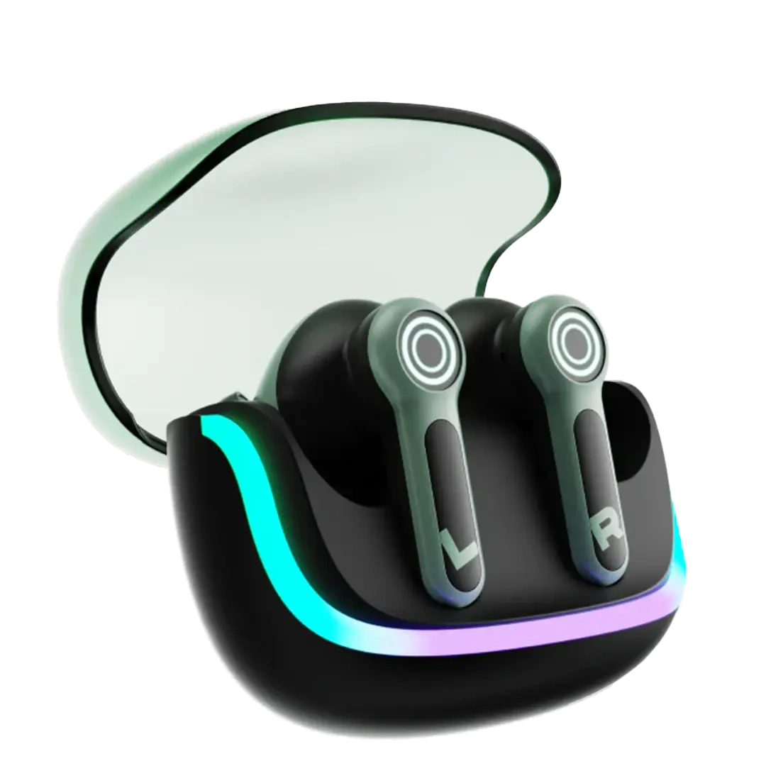 The Kick Aeropods 171 GT are gaming earbuds featuring a 37ms ultra-low latency, Bluetooth 5.4 connectivity, and up to 70 hours of total playback time. They include a Quad Mic with Environmental Noise Cancellation (ENC) for calls, Spark Charge Technology (10-minute charge for 120 minutes of playtime), and IPX5 water resistance. Additional features include dual device connectivity and RGB lighting.