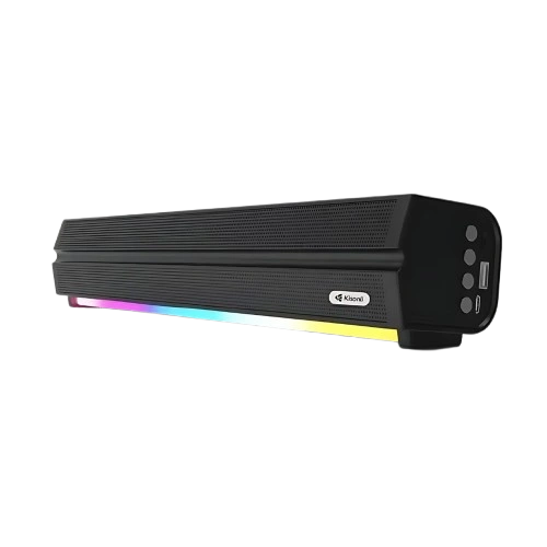 The Kisonli LED-802 is a portable, retro-styled Bluetooth soundbar with RGB lighting, featuring 10W total output (5W x 2), Bluetooth 5.3, a 1500mAh battery (3-5 hrs playtime), and multiple inputs like TF Card, USB, AUX, FM Radio, and Hands-Free Calls, offering versatile audio with dynamic lights for computers, phones, and parties, all in a plastic build with a bass horn.