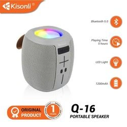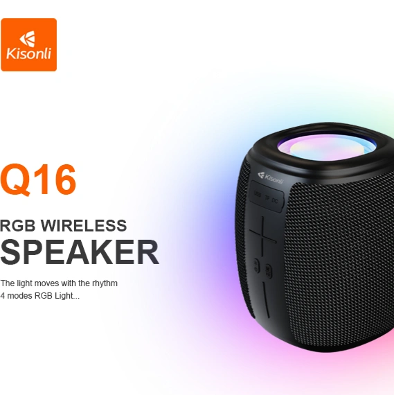 The Kisonli Q16 is a portable, wireless Bluetooth speaker known for its RGB lighting and super bass stereo sound, featuring Bluetooth 5.0, multiple inputs (AUX, USB, TF card, FM Radio), a 1200mAh (or sometimes 1800mAh) battery, 5W x 2 output, and TWS (True Wireless Stereo) support, ideal for parties with its compact, lightweight design and versatile connectivity.