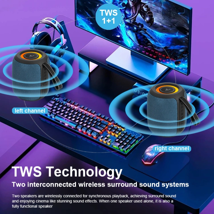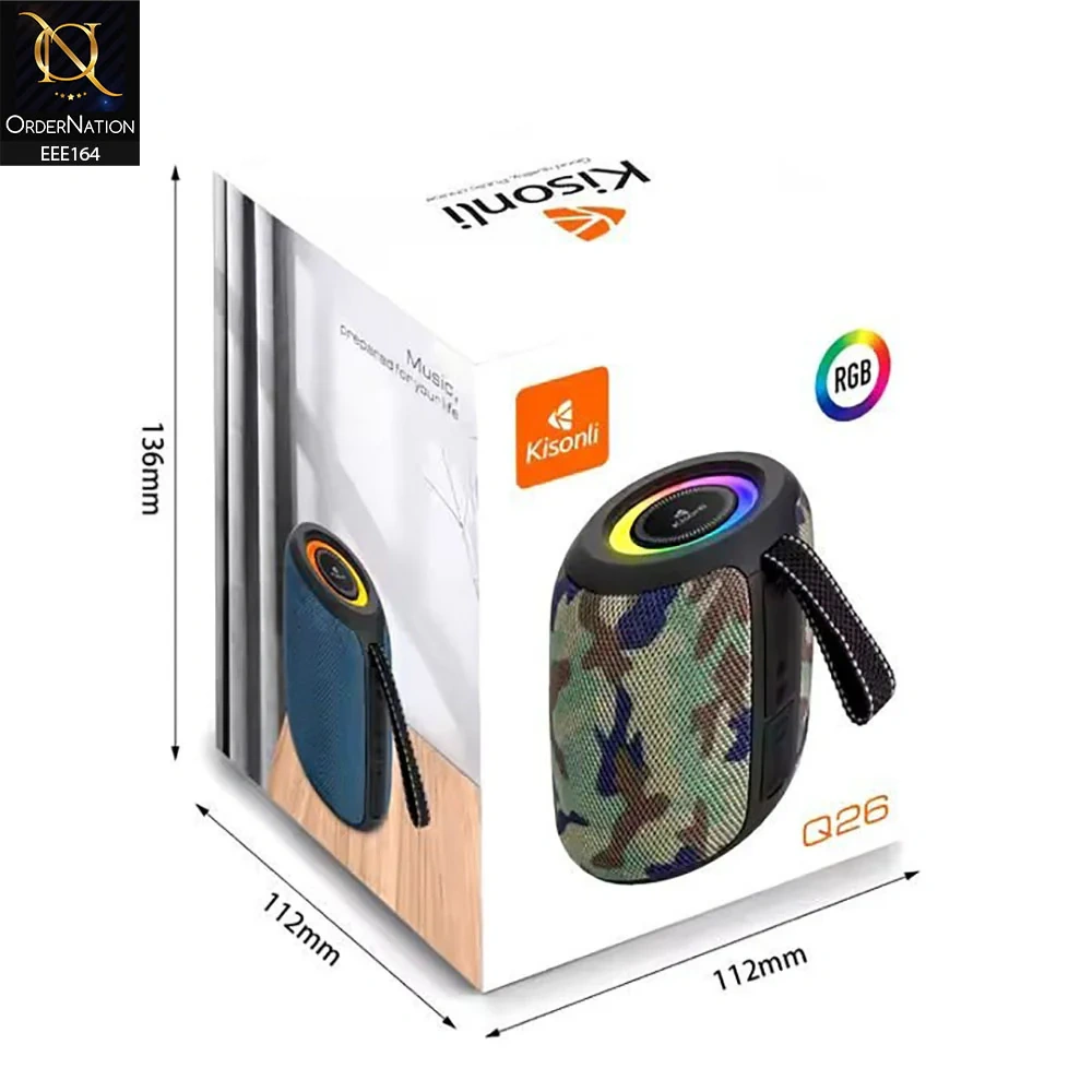 The Kisonli Q26 is a portable 10W Bluetooth speaker featuring Bluetooth 5.3, RGB lighting, and multiple playback options (BT, USB, TF Card, FM Radio, AUX) for versatile audio, powered by a 1200mAh battery for 2-6 hours of playtime, and charges via Type-C with a 2-3 hour charge time. It's made of ABS material, offers 360-degree sound, and includes TWS (True Wireless Stereo) pairing.