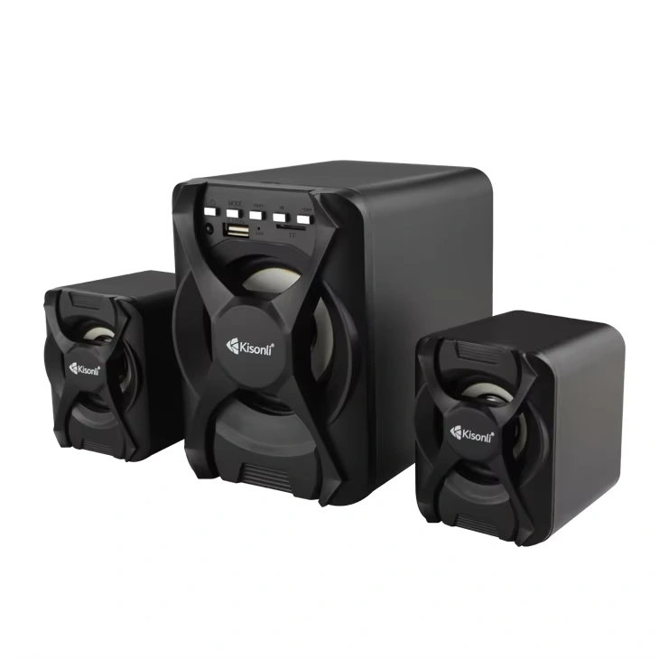 The Kisonli U-2500BT is a compact, USB-powered 2.1 speaker system featuring Bluetooth, TF Card, USB, AUX, and FM radio, delivering 6W total output (5W+3W*2) with a 20Hz-18KHz frequency range, supported by remote control for easy use with PCs, laptops, and phones.