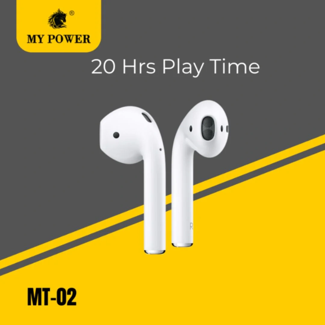 The My Power MT-02 is a budget-friendly, true wireless earbud set featuring Bluetooth 5.0, providing a stable 10m range, offering around 3.5-6 hours of music/talk time per charge (depending on source), with a 300mAh charging case for extended use, and supporting TWS functions. Key specs include 40mAh earbud batteries, 300mAh case, ~60-90 min charging time for buds and case, Lightning port, and compatibility with HFP/HSP/A2DP/AVRCP protocols.