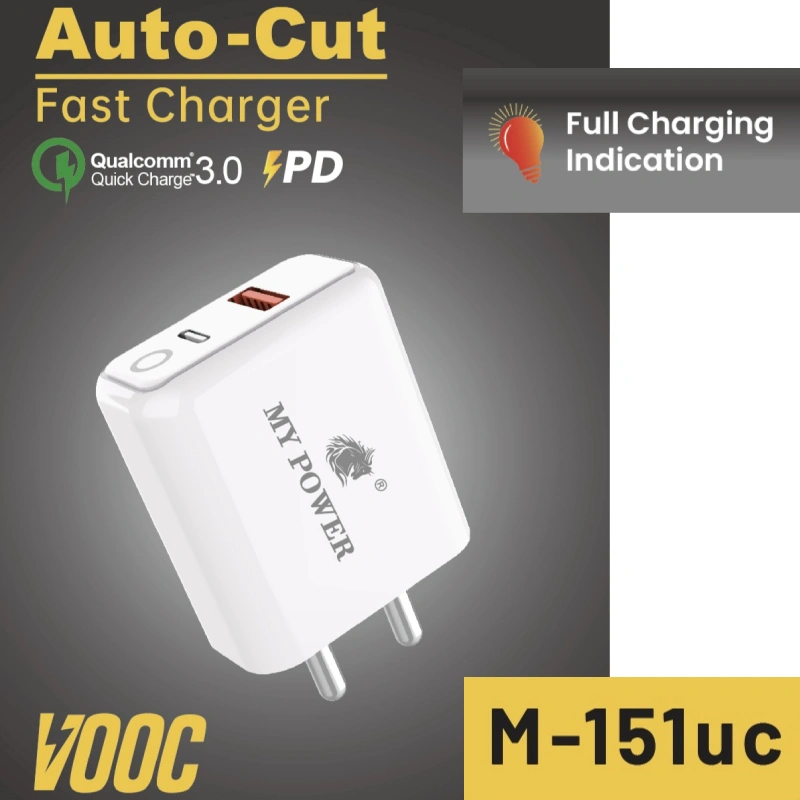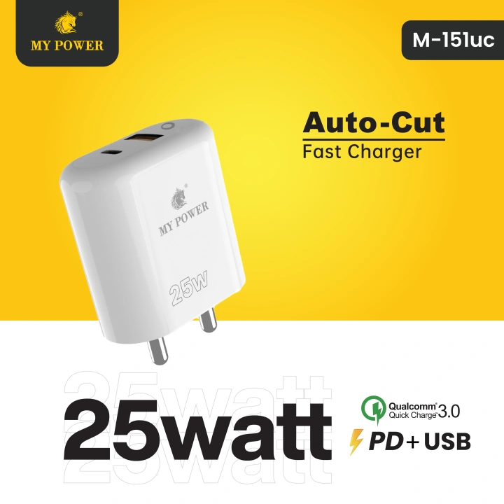 Your My Power M-151UC 25W AutoCut Charger is a USB-C Power Delivery (PD) adapter, providing 25 watts for fast charging devices like Samsung & iPhones, featuring built-in safety for over-voltage/current protection, and is designed for efficient, stable charging via its Type-C port, suitable for daily use and travel.