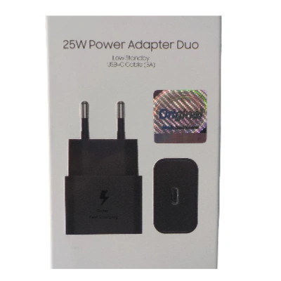 25W USB-C adapter supports Super Fast Charging (SFC) via Power Delivery 3.0 (PD 3.0) with Programmable Power Supply (PPS), delivering up to 25W output with variable voltages (e.g., 9V/2.77A PDO or 3.3-11V PPS), plus standard 5V/3A charging, ideal for compatible Galaxy devices and other USB-C gadgets.