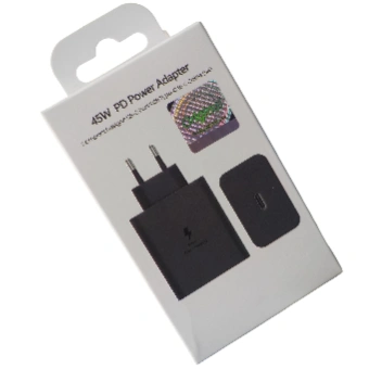 45W Type-C adapter supports Super Fast Charging 2.0 (SFC 2.0) via USB Power Delivery (PD 3.0) with Programmable Power Supply (PPS), delivering up to 45W for compatible devices like Galaxy Note 10+ series and newer models, using USB-C to USB-C connection and providing various output profiles (PDO: 9V/15V/20V; PPS: 3.3-21V) for efficient charging of phones, tablets, and other USB-C gadgets.