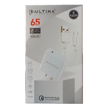 The Ultima 65W Type C to Type C Fast Charger (Model 851) is a wall adapter that provides a maximum power output of 65W and is primarily designed for fast charging compatible smartphones, tablets, and some laptops. The adapter itself has a Type-C port, and it typically comes bundled with a compatible Type-C to Type-C cable.