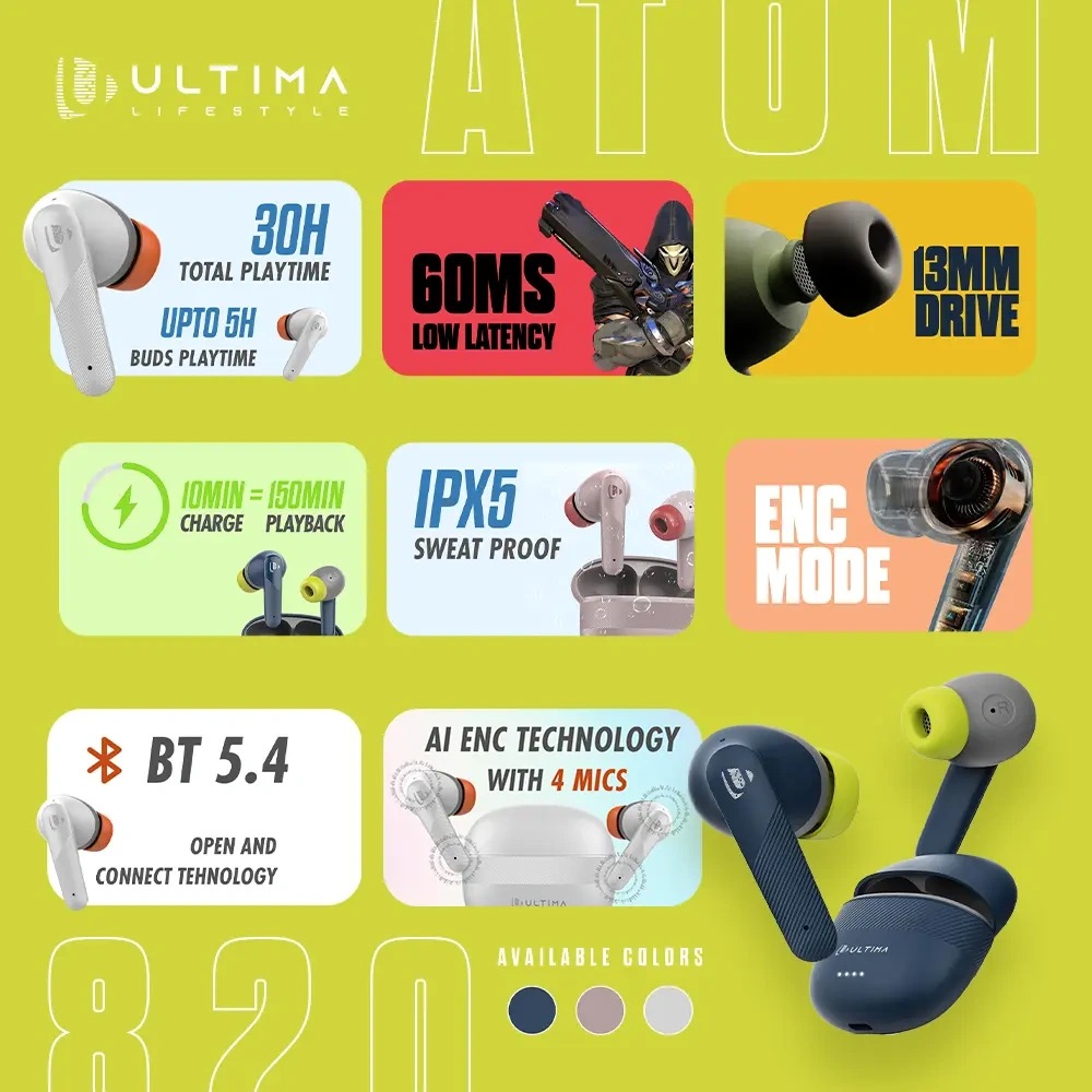 The Ultima Atom 820 earbuds feature Bluetooth 5.3, 13mm drivers, and a total playtime of up to 25 hours. They include a 60ms low-latency gaming mode, IPX5 sweat resistance, AI Environmental Noise Cancellation (ENC) for calls, and support for Google and Siri voice assistants. For charging, they use a USB Type-C port and support an ASAP Charge feature, offering 150 minutes of playtime from a 10-minute charge.