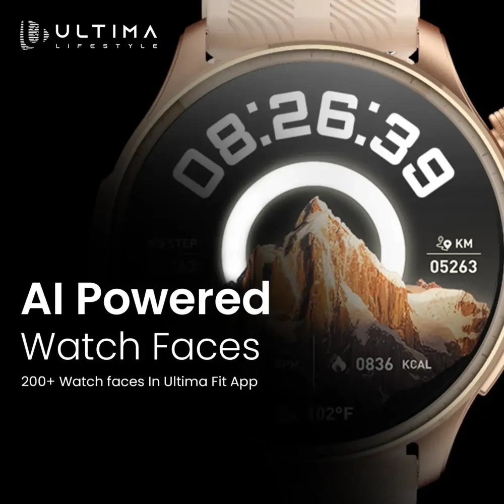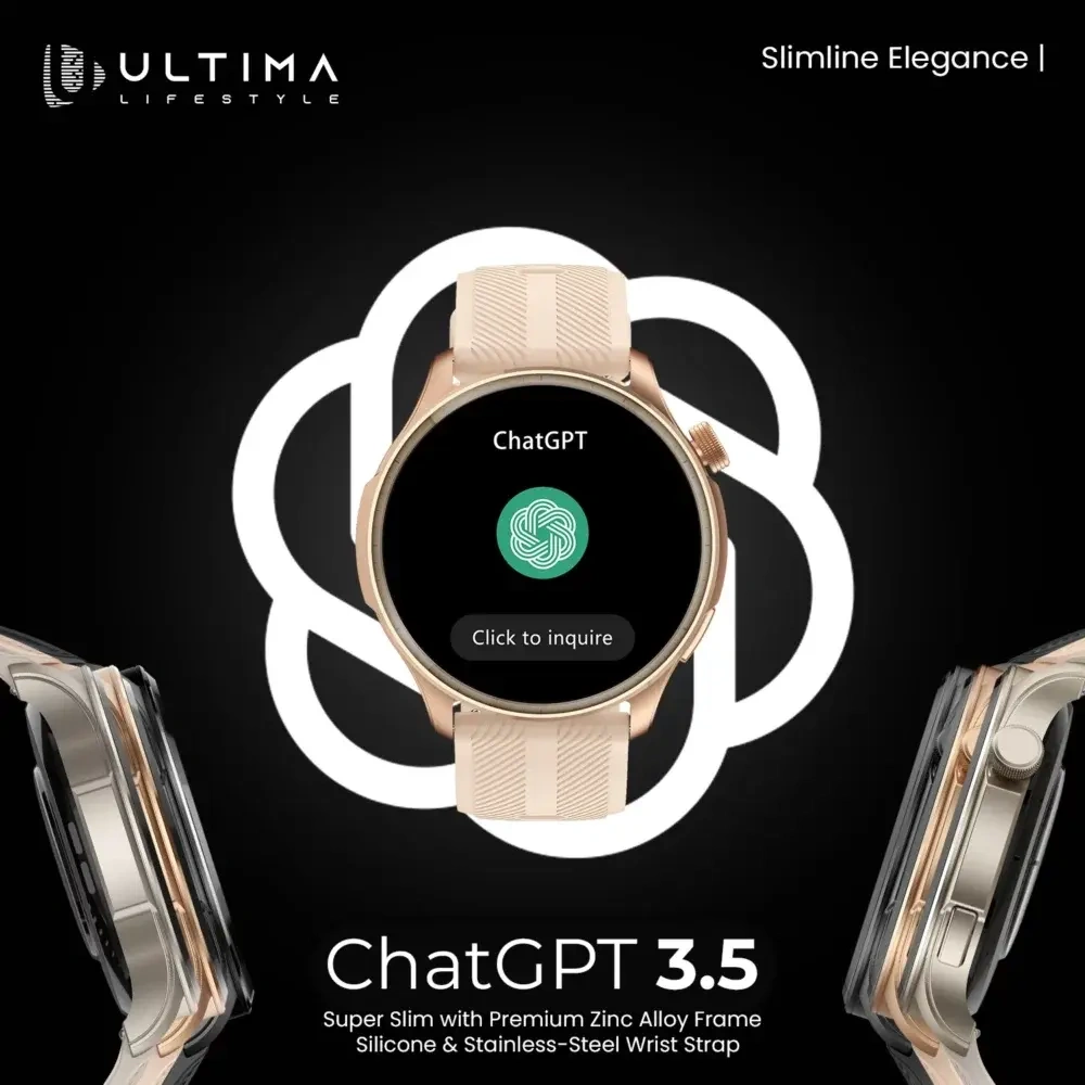 The Ultima Circle 2.0 smartwatch features a 1.43" TRU AMOLED display, Bluetooth 5.3 calling, and ChatGPT 3.5 integration. Its key specifications include a 250mAh battery, 3 ATM water resistance, over 100 sports modes, and health monitoring for heart rate, SpO2, and sleep. The design has a slim profile with a premium zinc alloy frame.