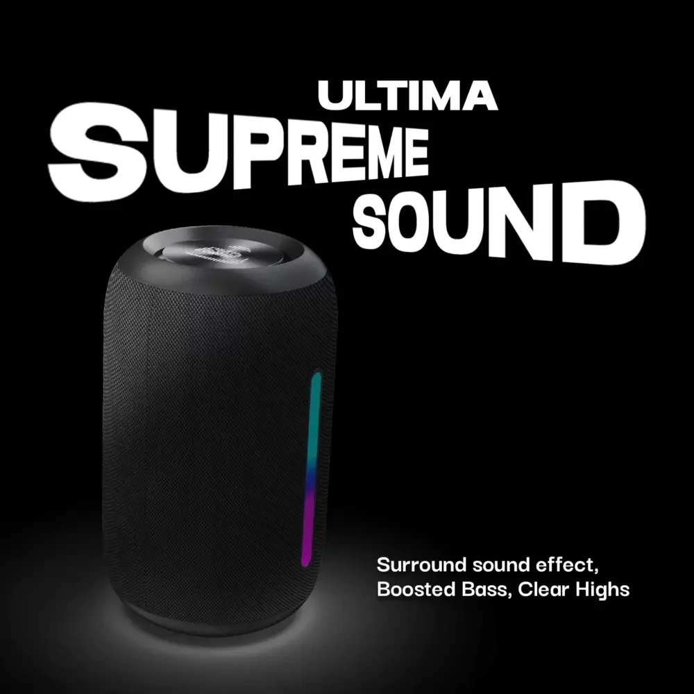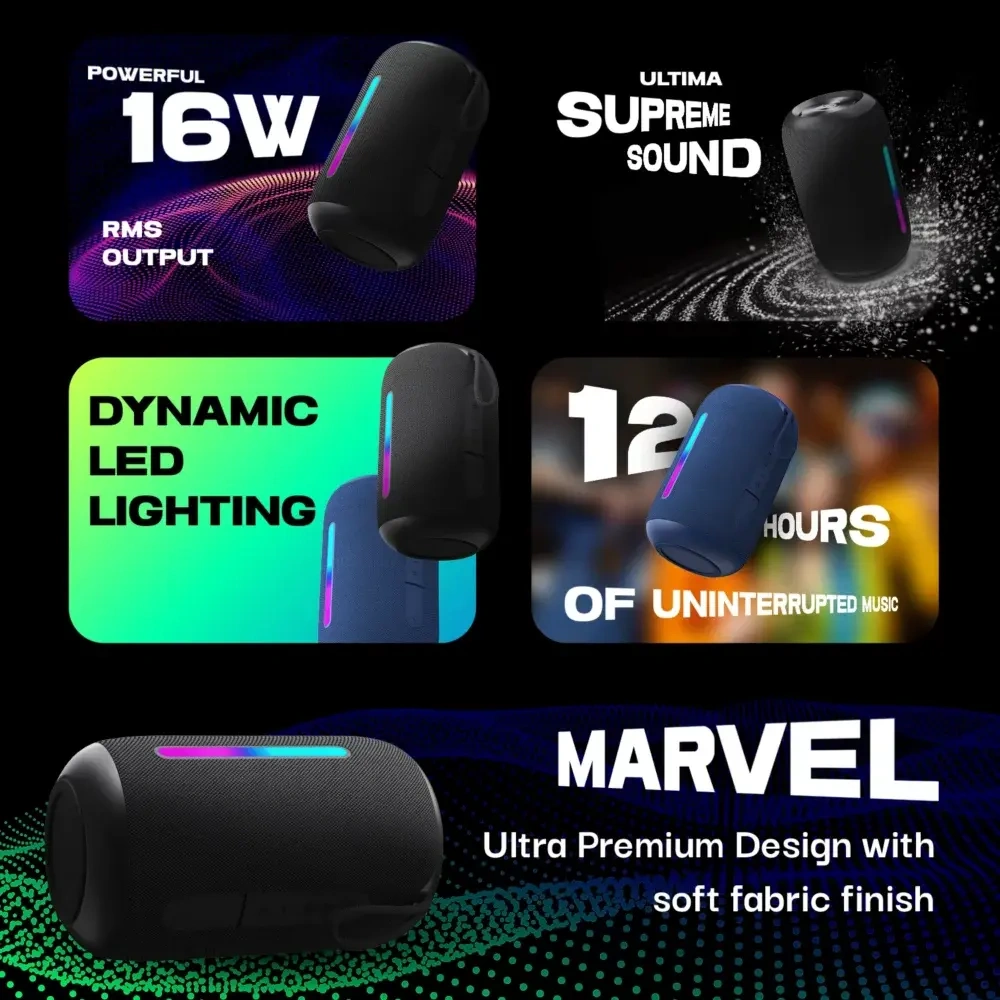 The Ultima Marvel speaker features a 16W RMS stereo output, a 50mm full-range driver, and a passive bass radiator. It has Bluetooth 5.3 connectivity up to 10 meters, a 3600mAh battery providing up to 12 hours of playtime, and is IPX5 water-resistant. Additional features include True Wireless Stereo (TWS) pairing, an AUX port, an SD card slot, a built-in microphone, and dynamic RGB LED lights.
