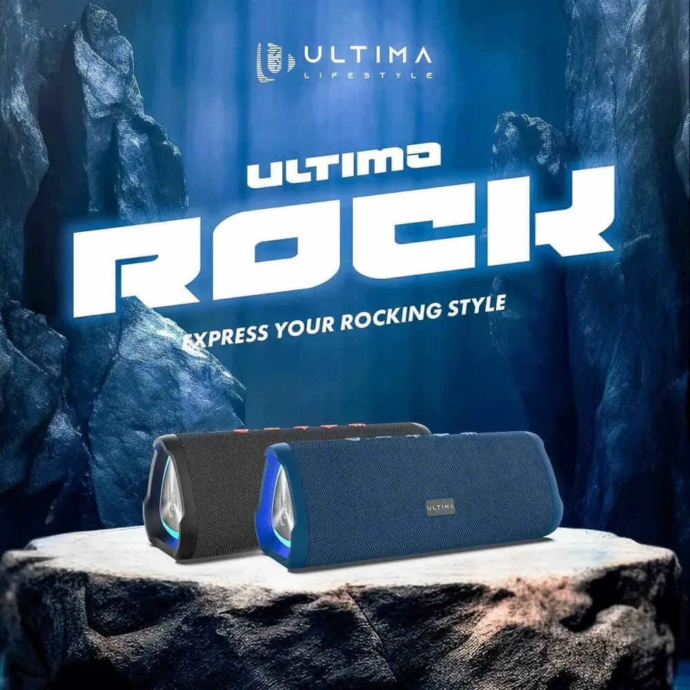 The Ultima Rock Bluetooth speaker is a portable, 12W RMS stereo speaker with Bluetooth 5.3, an IPX5 water-resistant rating, and up to 12 hours of playtime from a 2200mAh battery. Key features include a 10-meter transmission range, dual 2" drivers with passive bass radiators for powerful bass, and TWS (True Wireless Stereo) functionality to connect two speakers for a combined 24W