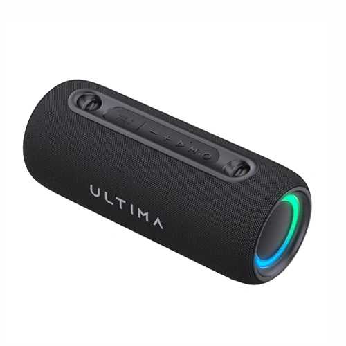 The Ultima S20 Soundbox is a portable Bluetooth speaker known for its 20W stereo output, EXTRA BASS, 70mm drivers, IPX5 water resistance, dynamic RGB lights, and 7-hour battery, featuring USB playback, TWS for pairing, and a built-in mic, housed in a fabric-wrapped ABS plastic body with a shoulder strap.