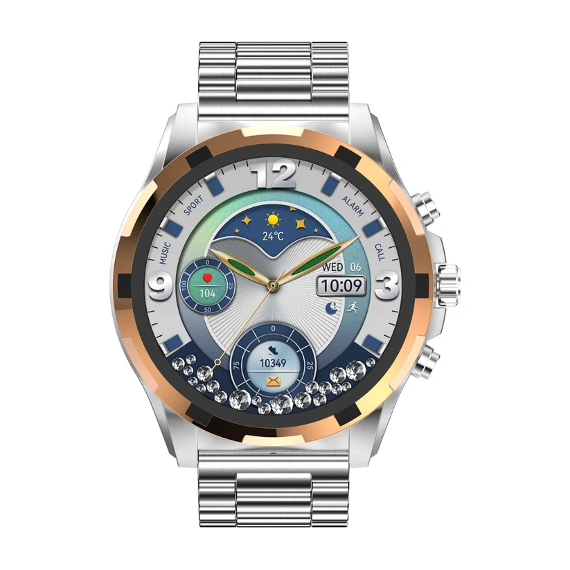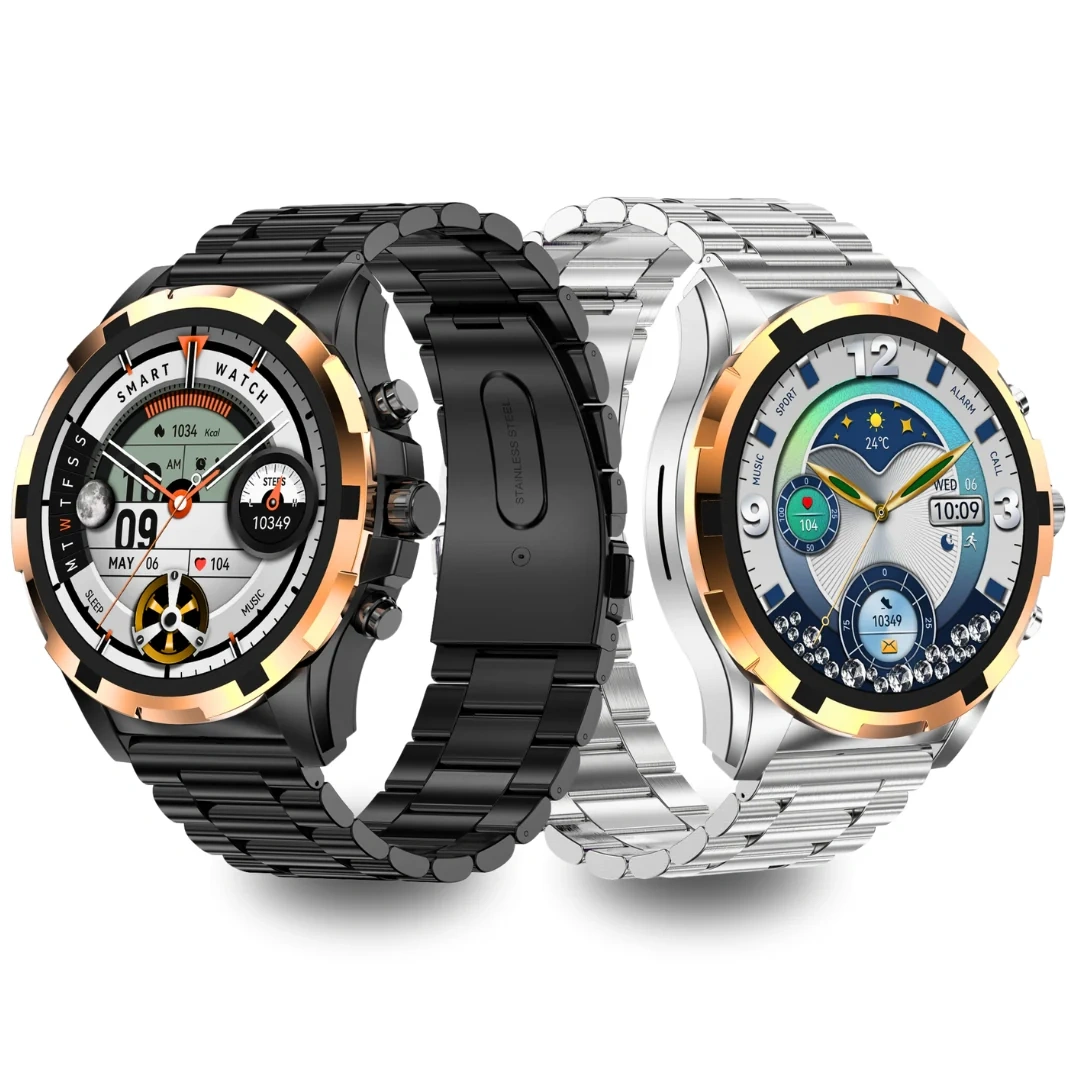 The Ultima E500 is a luxury smartwatch featuring a 1.43" AMOLED display, Bluetooth 5.3 calling, and a stainless steel and leather design. Key specs include over 100 sports modes, advanced health tracking (heart rate, SpO2, sleep), and 100+ watch faces. It has an IP68 water resistance rating and a battery life of 7-9 days with normal usage.