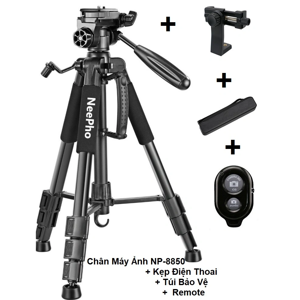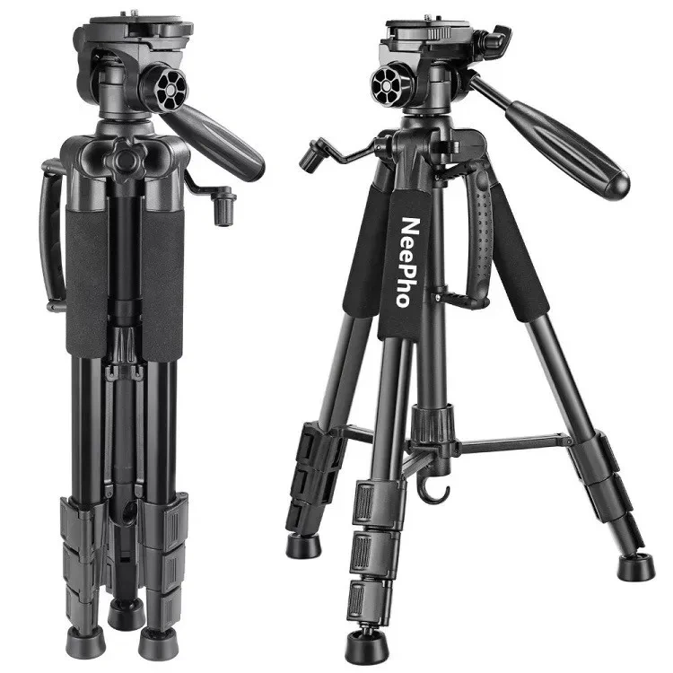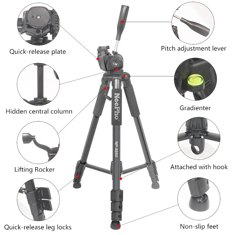 The NeePho NP-8850 is a 4-section aluminum professional tripod designed for DSLRs, mirrorless cameras, and smartphones. It features a 3-way pan head, a maximum height of 1750mm , a compact folded size of 560mm, and supports up to 11kg, making it suitable for versatile, stable, and portable shooting.