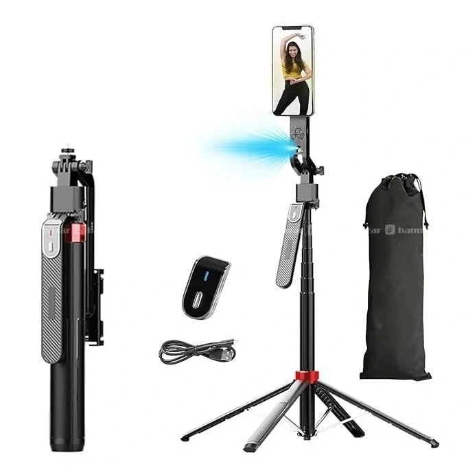 The Q185 Tracking Gimbal Selfie Stick is a 1.8-meter, 3-in-1 aluminum alloy device featuring 360° AI face tracking, 180° head rotation, and a built-in tripod stand. It includes a detachable Bluetooth remote, weighs 530g, and supports smartphones and action cameras for stable, hands-free video calls and live streaming.