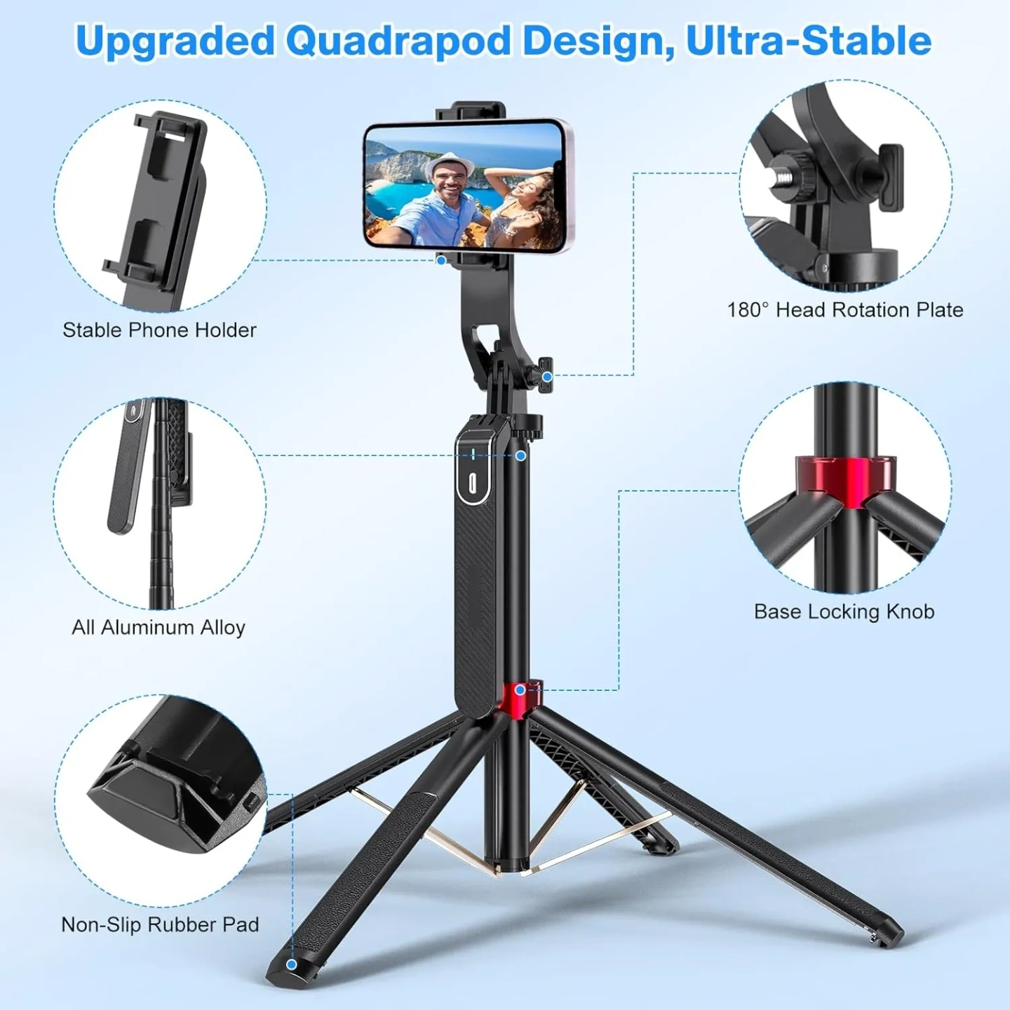 Stability: Features a sturdy base with collapsible legs to operate as a, standalone, tripod.